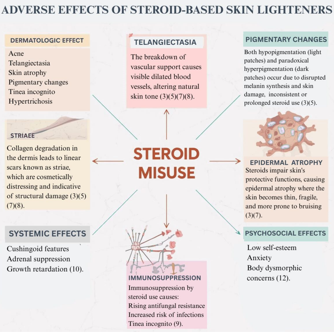 Table 1 summarizes key dermatological and systemic complications associated with chronic misuse of topical corticosteroids. Figure 1 summarizes adverse effects of steroid-based skin lighteners.